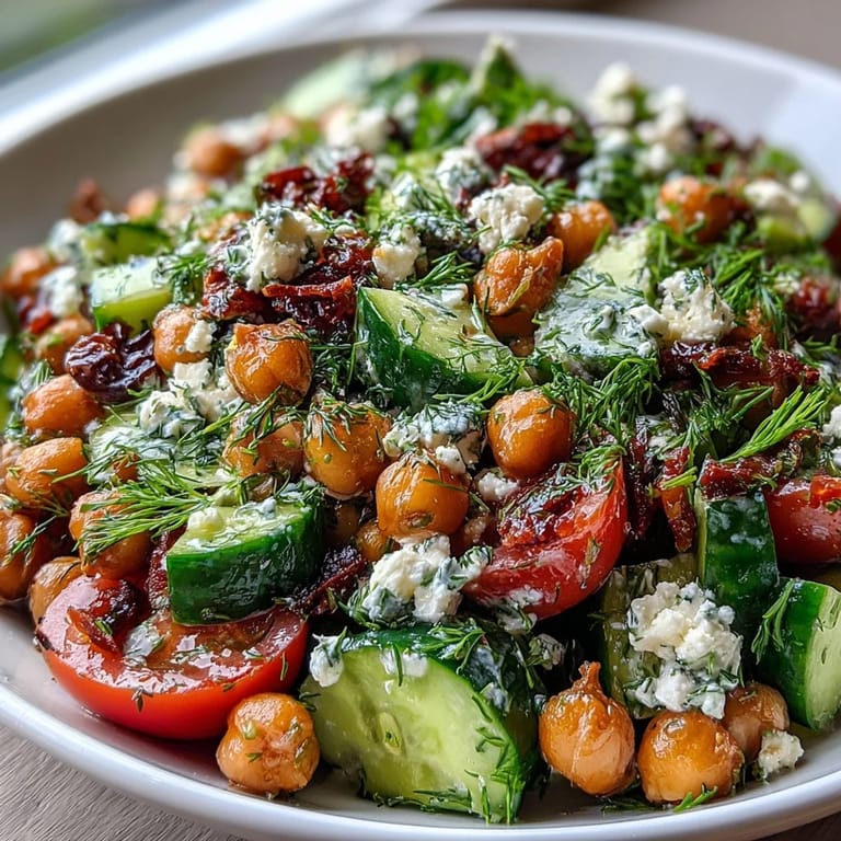 Save My neighbor stopped by one afternoon with a bag of tomatoes from her garden, and I realized I had nothing but chickpeas and some sad cucumbers in my fridge. What started as a scramble to use what I had became this salad that now shows up at every picnic I host. The magic isn't in complexity—it's in how bright and alive everything tastes when you let good ingredients speak for themselves.