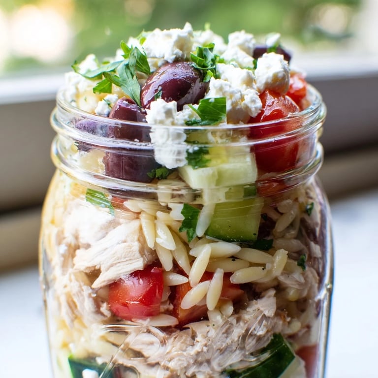 Save I used to eat lunch at my desk every day, sad desk salad after sad desk salad, until a coworker came in with one of these layered jars. The colors caught my eye first—ruby tomatoes, green cucumber, creamy white feta all stacked like edible stained glass. She shook it up right there, and I watched the oregano-scented dressing cascade through every layer. That afternoon I went straight to the store for mason jars.