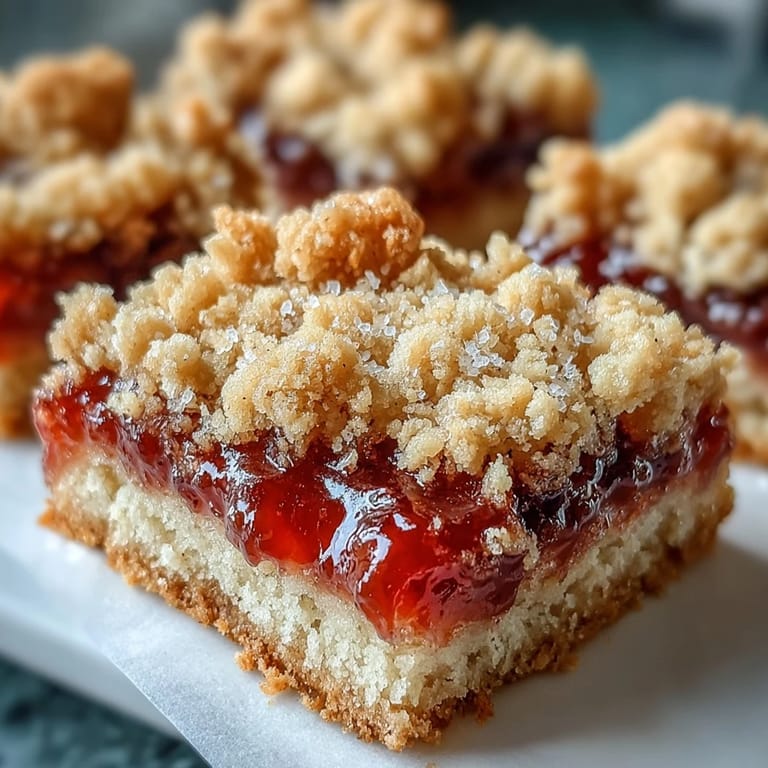 The magic of these bars lives in the contrast between the tender, crumbly cookie base and the jammy center and that golden streusel on top that looks almost rustic. Each bite gives you three distinct textures happening at once, which is why people find them so satisfying even though the ingredient list is simple. I once tried making them with warmer butter out of laziness and they came out dense and greasy—the temperature of your butter genuinely matters here.