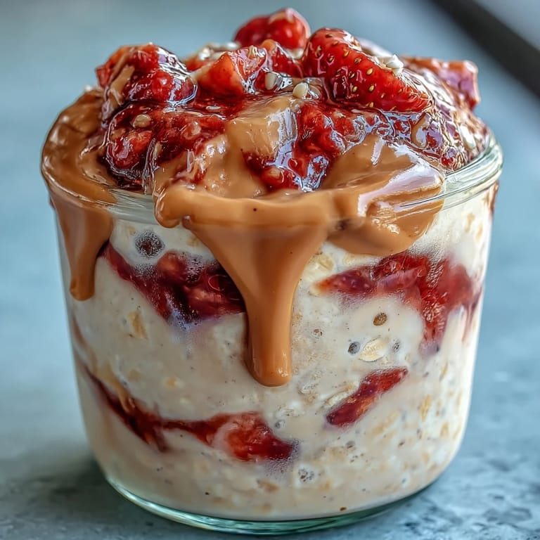Save My coworker swore by overnight oats but I was skeptical until she handed me a jar one Monday morning that tasted like dessert for breakfast. The vanilla protein, creamy peanut butter, and bright strawberry swirl transformed what I thought would be bland into something I actually looked forward to eating. That jar changed my entire approach to meal prep and protein intake. Now I make a double batch every Sunday, and my kitchen smells like vanilla and toasted peanuts while I'm layering them up.