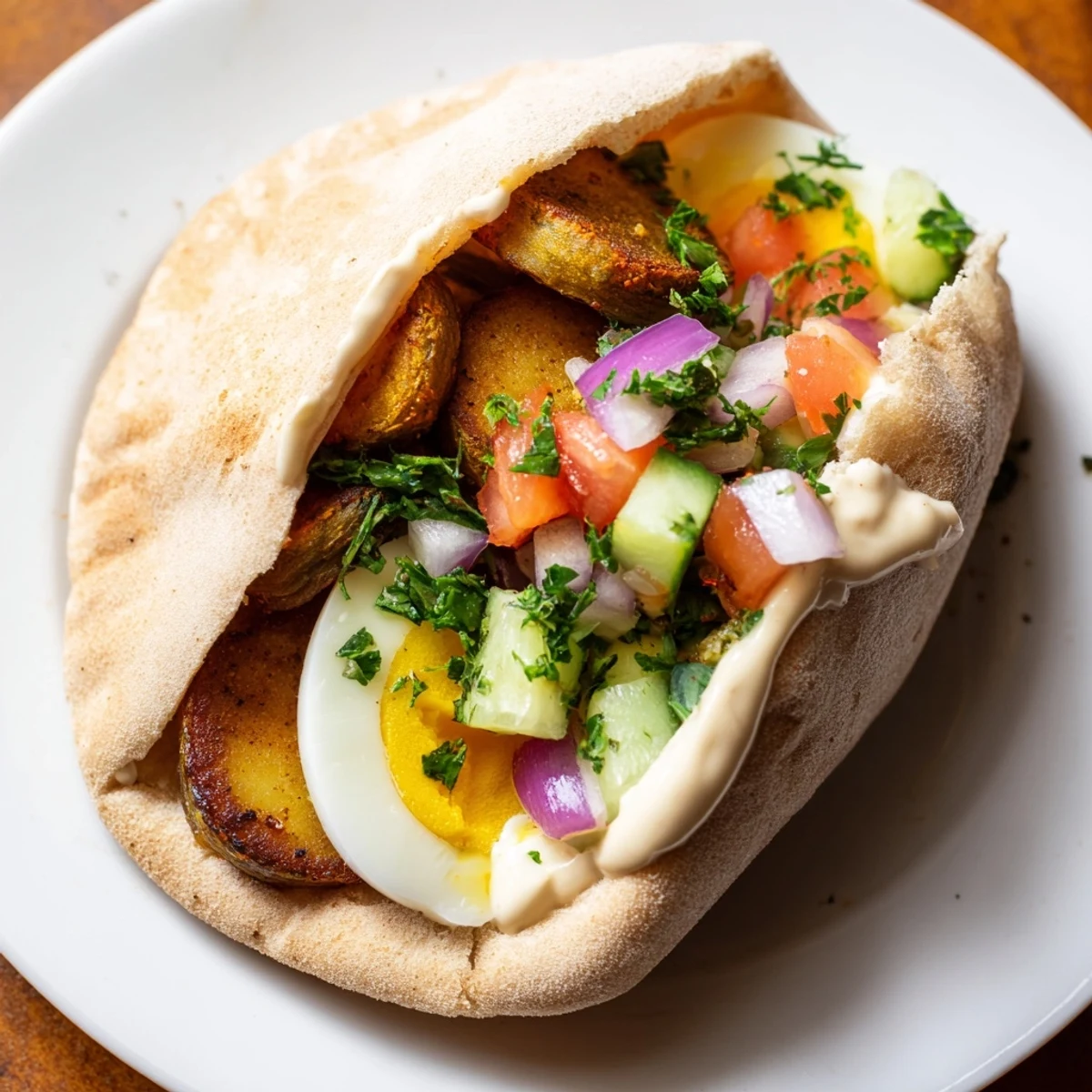 - Slice each warm pita open to create a pocket. Start with a layer of fried eggplant (still warm is key), then add sliced eggs, a generous spoonful of Israeli salad, and a generous drizzle of tahini sauce. Top with amba if you have it, pickles, cilantro, and hot sauce to your heat preference, then wrap tightly in paper so everything stays warm and contained while you eat.