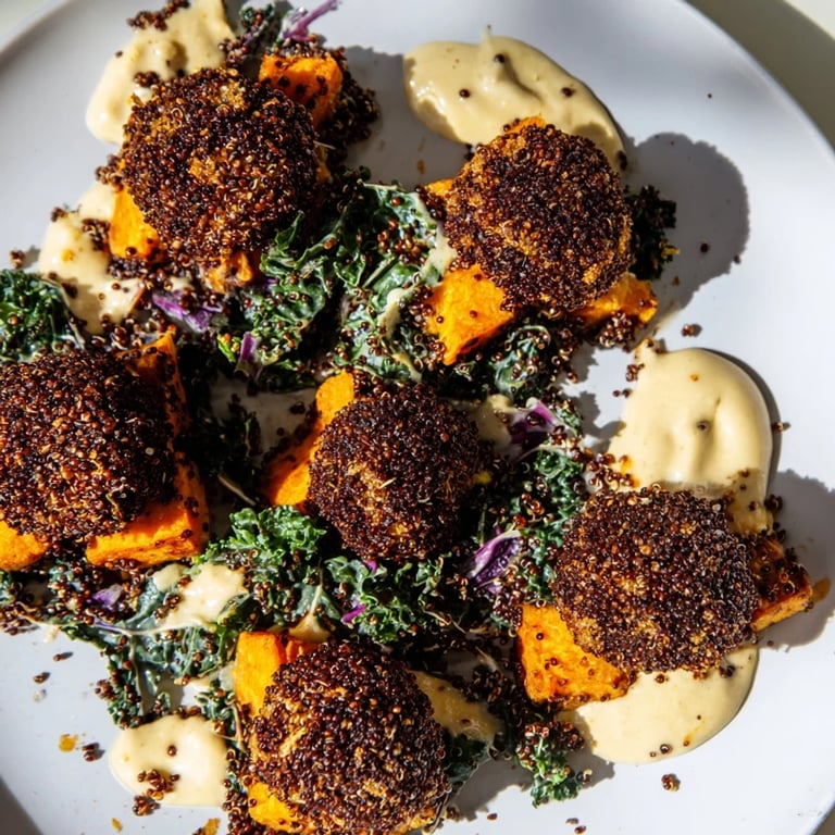 Save A vibrant, nourishing bowl featuring fluffy quinoa, caramelized roasted sweet potatoes, and crisp kale, finished with a zesty lemon-tahini dressing—a perfect light lunch or side inspired by coastal freshness.