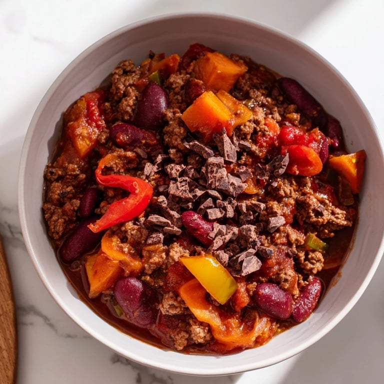 Save A rich, warming chili featuring ground beef, beans, tomatoes, and a touch of cocoa and cocoa nibs for deep, comforting flavor—perfect for a cozy night in.