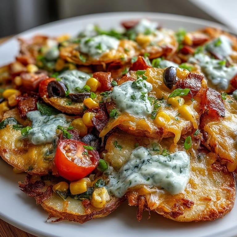 Save The secret to perfect Irish nachos lies in getting those potato rounds perfectly crispy. By slicing them evenly and roasting at a high temperature, you'll achieve golden edges with tender centers—the ideal base for all those delicious toppings. The Greek yogurt ranch adds a creamy, tangy element that ties everything together while keeping things lighter than traditional sour cream. And the best part? The explosion of colors from the rainbow of bell peppers, tomatoes, corn, and fresh herbs makes this dish as Instagram-worthy as it is tasty!