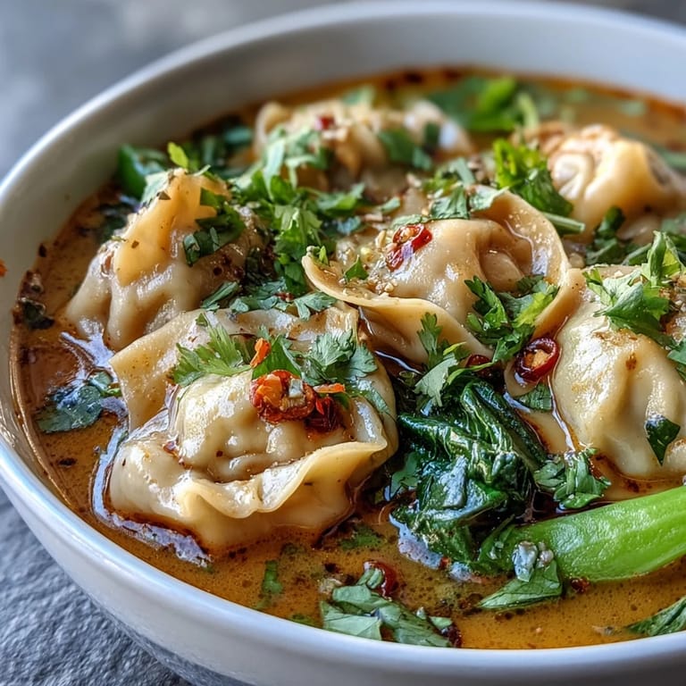 Save One rainy Tuesday, I was standing in my kitchen with absolutely nothing appealing for dinner when I spotted a bag of frozen wontons hiding in the back of my freezer. That single moment led me to what's become my go-to soup whenever I need something warm, nourishing, and ready in under thirty minutes. There's something magical about how red curry paste transforms a simple broth into something that smells like you've been cooking all afternoon, even though you haven't. The fresh greens wilt into the silky coconut broth while the wontons float on top like little edible clouds, and suddenly you've got a bowl of comfort that feels both exotic and deeply familiar.